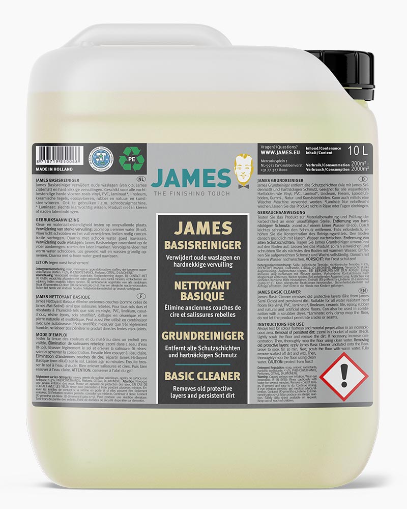 James Basisreiniger is een stripper, geschikt voor alle vochtbestendige harde vloeren zoals laminaat, vinyl, PVC, linoleum, keramische tegel, epoxyvloer, rubber of natuur- en kunststeen vloer.