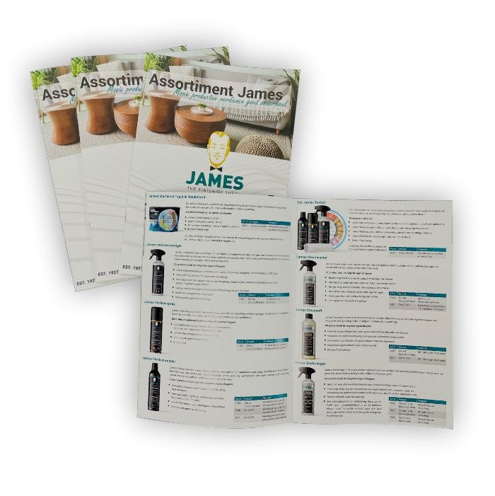 Je zal zien dat onze catalogus veel meer is dan een opsomming van onze producten. We nemen je onder andere mee in de historie van ons bedrijf, geven je een handig overzicht van de verschillende producten per categorie én we tonen een aantal van onze partners; merken die jij waar-schijnlijk in je winkel verkoopt en die actief James producten aanbevelen.
